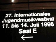 dessert menu at the Rosenberger on the Autobahn The Welcoming Ceremony in Vienna After a short freshen-up at the hotel we head over to the Austria Center for the opening ceremony. As we leave the bus we see an Australian group waiting to enter the building. We ask whether they are a choir or an orchestra and find out that each member does both. The main hall is jumping with activity. There are hundreds of kids already seated when we arrive and the room quickly fills up to overflowing. Several officials give official greetings, sharing with us some of the history of "the music capital of the world"--an honor that Vienna used to hold uniquely, but now shares with New York, Tokyo, and several other great musical cities. In his greeting one shares a list of famous composers that did their best work in Vienna, and it sounds like a "Who's Who" of classical music: Bach, Beethoven, Mozart, Schubert, Haydn, Strauss, Schoenberg, and Bruckner to just name the most famous. Many of these musicians were not BORN in Vienna, he is careful to point out, but were drawn to the city--as we have been drawn--because great music is happening here all the time. He offers us a challenge to compete, yes, but, more importantly, make friends with other musicians, and together soak up the spirit of great music that is alive in Vienna and take it back to "every continent of the world." The speeches are followed by two short concerts, one by a boy's choir with each singer dressed like Mozart, and the other by a very fine youth symphony from Wales. We cross the Danube to get to the Austria